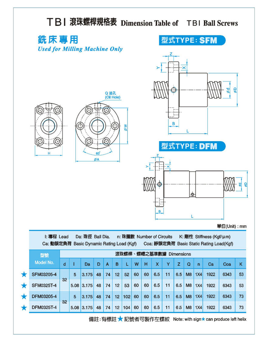 產品名稱: | SFM3205螺母絲杠現貨,TBI銑床專用絲桿參數 | |