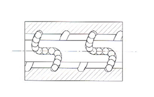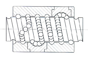 U、I型螺帽 此種型式是由鋼珠沿著內循環循環器溝槽,斜斜的越過絲桿牙峰回到原點。一般為一卷鋼珠一次循環。此種型式絲桿至少要有一端完全通牙,適用于直徑較小的絲桿,一般都采用了金屬循環器。 |