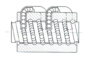 T型螺帽 此種型式是由鋼珠滾動于絲桿和螺帽之間的溝槽而前進,再被外循環管前端撈起,通過循環管路徑回流至循環管另一端,再回到原點的循環方式。一般為多卷鋼珠一次循環,外型可采用圓周型和管突出型。 |